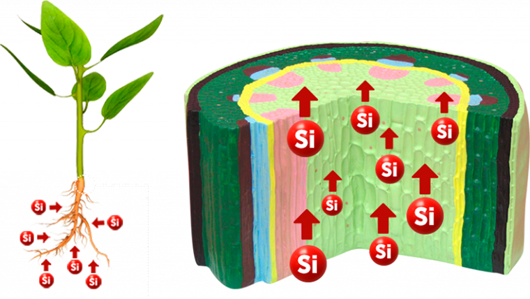 Absorvido pelas raízes da planta e via xilema é depositado nas folhas formando uma camada de sílica. Assim, ele melhora a arquitetura de planta e realiza um efeito protetor.